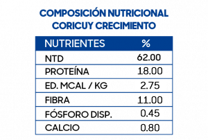 Alimentar por 30 días ad libitum. Nuestro alimento permite una buena ganancia de peso, un correcto desarrollo óseo, crecimiento rápido garantizando un buen estado sanitario.